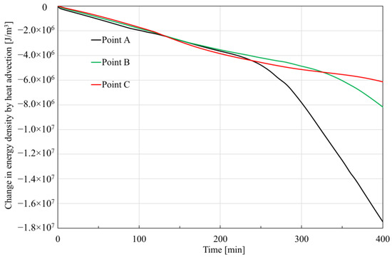 As shown in Figure 7, heat advection generally has a negative effect on the energy density, and this effect is stronger at the position closer to the depressurization boundary. The reason behind this is that the fluid flow is generally stronger at positions closer to the depressurization boundary. Additionally, it is observed that the order of magnitude of the peak value is 107 J/m3 in this case, much greater than that caused by the conduction. Similar to the explanation in Section 3.3.2, fluid flow could transfer more heat, so it makes a bigger contribution to the reduction in energy density.