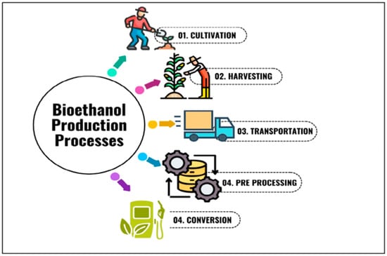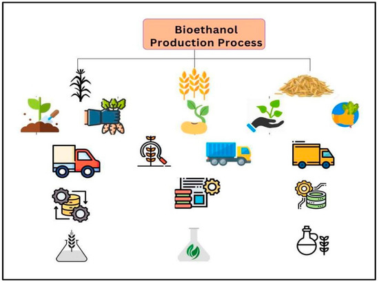 Transportation plays a critical role because its mode significantly impacts energy use and emissions. Fuel-efficient transport methods can reduce the environmental footprint. Typically, agricultural residues serve as the source of feedstock, making transportation logistics even more critical to ensure timely delivery and prevent spoilage and material degradation. Therefore, when the feedstock is transported to a storage facility, it goes through preprocessing. Preprocessing usually involves drying, shredding, bailing, cutting or grinding the biomass to ensure uniform size and quality, which facilitates the conversion process [36]. Finally, the conversion process converts the prepared feedstock into bioethanol. This stage further includes chemicals, enzymes and microbial treatments according to the feedstock’s composition. Pretreatment is vital for lignocellulose materials, such as corn stover, wheat straw, and rice husk, to convert them into fermentable sugars. Moreover, advanced technologies, such as pretreatment and enzymatic hydrolysis, increase the efficiency of conversion while minimizing energy consumption and byproduct generation [37]. The following feedstocks describe each biofuel source.