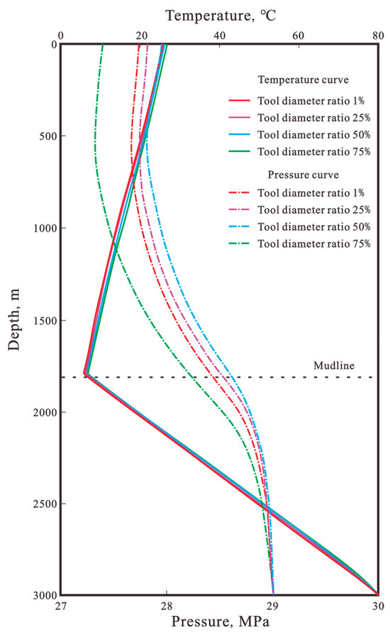 We found from the numerical simulation results that the effective gas flow volume of the wellbore decreased and the fluid flow rate increased during the transport of the tool to the bottom of the well. The temperature and pressure environment in the wellbore is changed, causing changes in temperature and pressure (Figure 2). Among them, with the increase in tool size in the wellbore, the temperature field of the wellbore has little effect, and the pressure field changes with a larger magnitude, especially as the pressure perturbation above the mudline is obvious, which affects the risk of hydrate generation in the wellbore to a certain extent.