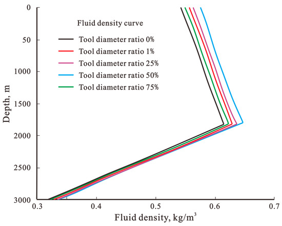 Below the mudline, the temperature gradually increases with depth and the fluid density in the wellbore gradually decreases. As the size of the operating tool in the wellbore changes, the fluid density shows the same pattern as above the mudline, but the overall change is not large. Therefore, the lowering of the tool during gas well production has a certain promotion effect on hydrate generation in the wellbore. However, the size increases to a certain degree, and the hydrate generation capacity is weakened.
