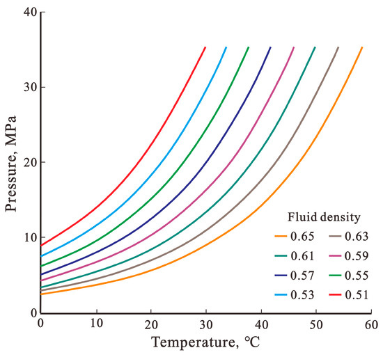 We recalculated the wellbore hydrate phase curve for different fluid densities (Figure 4). The left side of the phase curve shows the region of hydrate generation in the wellbore, and the pressure required for hydrate generation increases exponentially as a whole. As the density of gas and water two-phase flow in the tubing column gradually rises, the hydrate phase state gradually shifts to the right. It shows that under the same temperature condition, the pressure required for hydrate formation in the wellbore is smaller, and the denser fluid is more likely to generate hydrate.