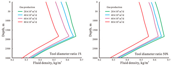 On the basis of this understanding, the variation in gas density in the wellbore with the tool movement speed was analysed by numerical calculation for tool size shares of 1% and 50%. It was found that the tool movement speed towards the bottom of the well has almost no effect on the wellbore temperature and pressure fields, and there is little difference in the gas density in the wellbore at different movement speeds (Figure 5). However, when the production rate is changed, the fluid density in the wellbore decreases gradually with the increase in production rate, inhibiting the generation of hydrates (Figure 6). This explains why the hydrate generation capacity decreases when the tool size is increased to a certain level (Figure 3). The greater the tool size, the greater the throttling effect of the gas is induced. After throttling the gas, the pressure becomes smaller, the volume increases, and the density decreases. At the same time, the flow rate of the gas increases after passing through the tool, and the hydrate generation and deposition capability at larger flow rates worsens.