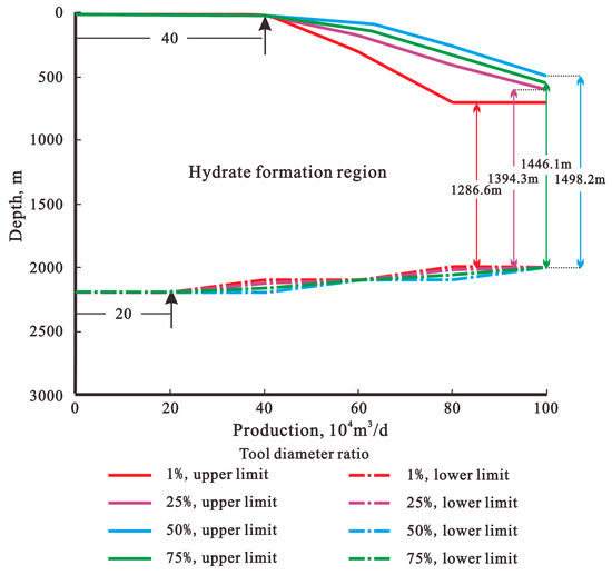 Since the tool movement velocity does not affect the hydrate generation. We selected a tool movement velocity of 0.5 m/s and analysed the upper and lower depth limits of hydrate deposition in the wellbore under different production conditions based on the phase curve plate. The effect of different tool sizes on the range of wellbore hydrate generation during gas well production was further determined. Under the conditions of different tool sizes, with the increase in gas well production, the lower inflexion point of the depth of wellbore hydrate deposition appeared at the gas well production rate of 20 × 104 m3/d. The upper inflexion point of the depth of the wellbore hydrate deposition appeared at the gas well production rate of 40 × 104 m3/d, and the range of the depth of hydrate deposition began to decrease substantially. The hydrate deposition range corresponds to the lowest wellbore length when the production rate reaches 100 × 104 m3/d. At 1% tool size, the minimum length of wellbore hydrate generation area is 1290.84 m; at 25% tool size, the minimum length of wellbore hydrate generation area is 1394.3 m; at 50% tool size, the minimum length of wellbore hydrate generation area is 1498.2 m; and at 70% tool size, the trend of wellbore hydrate generation is reversed, and the hydrate generation trend of the wellbore hydrate generation area is reversed compared to that at the 50% tool size. When the tool size is 50%, its hydrate generation area range decreases and the minimum length is 1446.1 m (Figure 7). It shows that under the same conditions, with the increase in tool size, it directly increases the risk of hydrate generation and magnifies the hydrate generation area. However, as the tool size increases to a certain level, i.e., after more than 50%, the risk of hydrate generation in the wellbore decreases and the generation area starts to shrink. This result is consistent with the understanding of the effect of tool size on fluid density and hydrate generation capacity.
