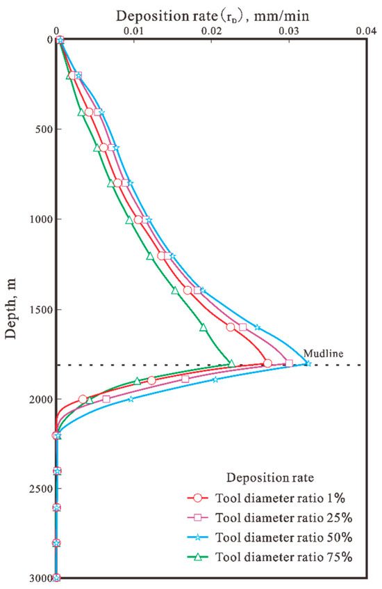 Combining the results and the understanding of the hydrate generation area prediction, we further analysed the hydrate deposition rate in the wellbore under different tool size conditions. This work was carried out based on the Turner hydrate generation kinetic model [28]. It is considered that the range of hydrate generation in the wellbore decreases after the production rate is higher than 40 × 104 m3/d. Therefore, the production rate of 40 × 104 m3/d and the tool movement speed of 0.5 m/s were selected as the production and operating conditions of the gas well. On the basis of the wellbore temperature and pressure model, the hydrate deposition rate model under deepwater gas well operation in deepwater wellbore was established.