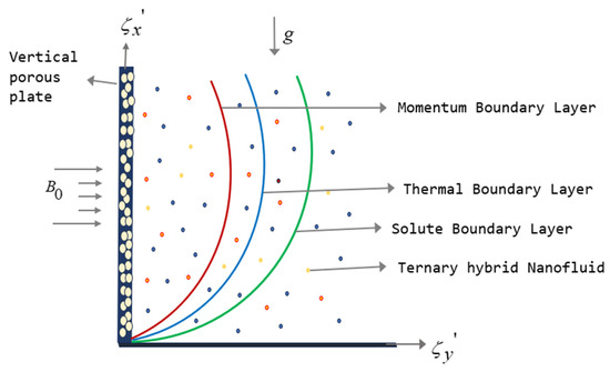 Unsteady MHD natural convective, heat, and mass transfer flow of viscous incompressible ternary hybrid nanofluid along infinite vertical porous plate influenced by Soret effect and thermal radiation is considered. Figure 1 illustrates the problem’s physical model.