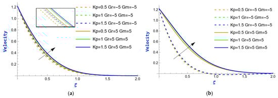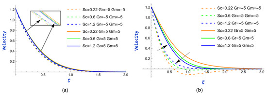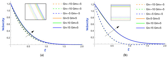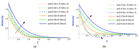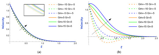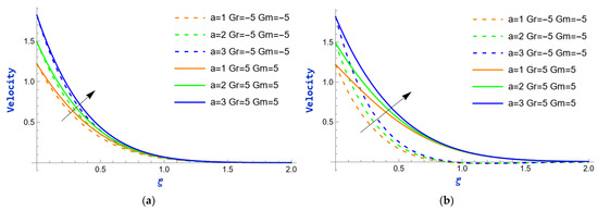 The velocity variation caused by the exponential parameter during heating and cooling (i.e., and ) of the plate is shown in Figure 2. In both figures, it is evident that the velocity exhibits an upward trend as the values of rise. This is because, at the boundary layer, where viscosity has a disproportionately large impact, the velocity profile frequently exhibits a sharp increase as the exponential parameter rises. The consequences of the mass Grashof number () on velocity profiles for fixed values of (i.e., ) are depicted in Figure 3. The mass Grashof number is a non-dimensional number that characterizes the relative effects of buoyancy and viscous forces in fluid flow due to mass transfer. When is high, it indicates that buoyancy forces (due to differences in concentration or temperature) are dominant compared to viscous forces. This dominance results in an augmentation of flow velocity because buoyancy forces promote fluid motion, causing it to accelerate. Consequently, in both scenarios, as strengthens, the velocity rises. Additionally, there is a significant increase in the momentum boundary layer thickness. The impact of the thermal Grashof number () on velocity profiles is observed in Figure 4, while the values of are held constant (i.e., ). The thermal Grashof number, , is a dimensionless term that measures the relative importance of thermal buoyancy forces to viscous forces in fluid flow, particularly in natural convection scenarios. The velocity enhances as increases. This relationship arises because a higher denotes a stronger influence of thermal buoyancy forces compared to viscous forces. As thermal buoyancy becomes more significant, viscous forces are diminished, reducing resistance. This facilitates the fluid’s movement, resulting in higher velocity profiles within the flow.