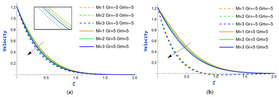 This section is dedicated to examining the numerical computations and the impact of relevant non-dimensional parameters on the distributions of velocity, temperature, and concentration. The results are illustrated graphically in figures, while non-dimensional derived quantities are discussed through tabulated values. Acknowledged for its symbolic computing power, Mathematica is utilized to analytically resolve the intricate system of mathematical equations. To find the numerical resolution of the equations, MATLAB (2025a) software is used. Figure 2a, Figure 3a, Figure 4a, Figure 5a, Figure 6a, Figure 7a, Figure 8a, Figure 9a, Figure 10a, Figure 11a, Figure 12a, Figure 13a, Figure 14a and Figure 15a illustrate the profiles of velocity, temperature, and concentration for Case I, while Figure 2b, Figure 3b, Figure 4b, Figure 5b, Figure 6b, Figure 7b, Figure 8b, Figure 9b, Figure 10b, Figure 11b, Figure 12b, Figure 13b, Figure 14b and Figure 15b present the corresponding profiles for Case II. In the current investigation, calculations are carried out using the following default parameter values: = ±5, = ±5, = 1, = 0.5, = 0.5, = 0.6, = 1, = 0.01, = 0.02, and = 0.03.