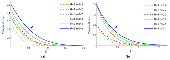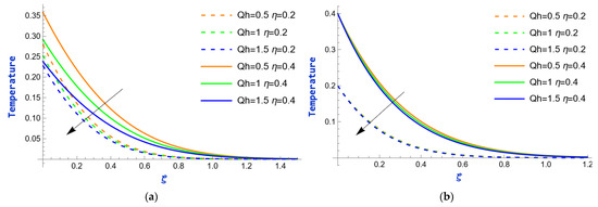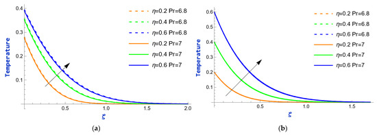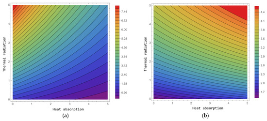 The profiles of velocity for various values of the permeability parameter,, under both heating and cooling conditions of the plate are presented in Figure 8. The corresponding figures indicate that a spike in the value of contributes to an increase in the momentum boundary layer thickness. Due to an advancement in the porosity parameter, the permeability of the medium improves, meaning there is less obstruction to fluid motion within the pores. This allows the fluid to move more freely, thus increasing the velocity within the boundary layer. The impact of the radiation parameter, , on temperature profiles at = 0.2 and = 0.4 is depicted in Figure 9. Thermal radiation is the release of energy from a body’s surface in the form of electromagnetic waves, mostly infrared. An increment in the thermal radiation parameter causes the amount of heat energy radiated to the surrounding fluid to increase, thus contributing additional energy to the system. This energy is absorbed by the fluid, which raises the temperature. Figure 10 provides an analysis of the influence of the heat absorption parameter, , on temperature profiles. An increase in the heat absorption parameter typically indicates that more heat is being removed from the system. This greater heat extraction will cause a reduction in the overall temperature of the fluid, as the energy available to raise the temperature is diminished. So, as increases, the temperature decreases. Figure 11 exemplify the effect of time, , on the temperature field for the values of = 6.8 and = 7. Observations indicate that the temperature rises rapidly as the value of increases.