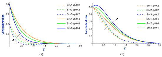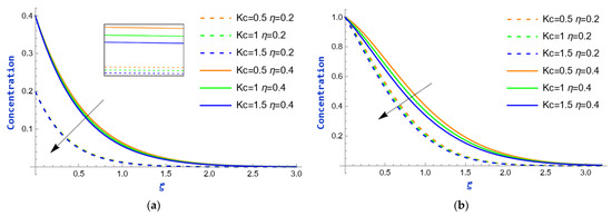 Figure 12 depict the concentration distribution as a function of , considering the relevance of the chemical reaction parameter, , at = 0.2 and = 0.4, respectively. A first-order chemical reaction is a reaction where the rate of reaction is directly proportional to the concentration of a single reactant. In both cases, an increase in displays a contrasting effect on concentration, indicating that the fluid’s concentration progressively declines as the value of augments. The reason behind this is that as expands, the consumption of the species accelerates, resulting in a considerable drop in its concentration. The effect of the Schmidt number, , on concentration profiles at = 0.2 and = 0.4 is displayed in Figure 13. An upsurge in appears to lead to a decrease in both concentration distribution and its boundary layer thickness. From the perspective of physics, the Schmidt number , a dimensionless quantity used in fluid mechanics and mass transfer, is expressed as the ratio of kinematic viscosity (momentum diffusivity) to mass diffusivity. As a result, when increases, the diffusion of the solute or species becomes less effective relative to momentum transfer, leading to a decrease in concentration over time. Figure 14 depicts the consequence of the Soret effect parameter, , on the concentration fields of flow. The Soret effect, also termed thermal diffusion, refers to the phenomenon in which a temperature gradient causes the movement of species or particles in a mixture, leading to a concentration gradient. Usually, higher thermal diffusion drives the species away from the region, reducing the overall concentration. Thus, in Case I, a rise in culminates in a reduction in the thickness of the concentration boundary layer. However, in Case II, a surge in concentration profiles is observed with enhancing values of . The reason is that, as increases, the concentration rises because a stronger Soret effect causes species to migrate more efficiently from hotter regions to cooler regions, leading to a higher accumulation of species in the cooler regions. The repercussions of time on the concentration field are portrayed in Figure 15 for = 6.8 and = 7. In each case, it is observed that the concentration exhibits an upward trend as the values of grow.
