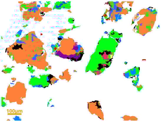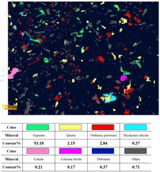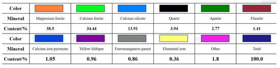Table 2 indicates that the steel slag mainly contains calcium (30.35%), iron (18.96%), silicon (6.83%), and magnesium (4.08%), with other elements making up the remaining percentage. Figure 1a and Figure 2 combined show that the main materials of steel slag are magnesium ferrite, calcium ferrite, and calcium silicate, which have different degrees of encapsulation among one another. The quartz content is 3.94%, which is embedded in the edge or interior of magnesium ferrite and calcium ferrite, and the contents of other minerals, such as apatite, fluorite, and calcium iron pyroxene, are less.