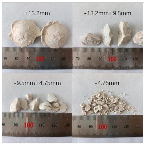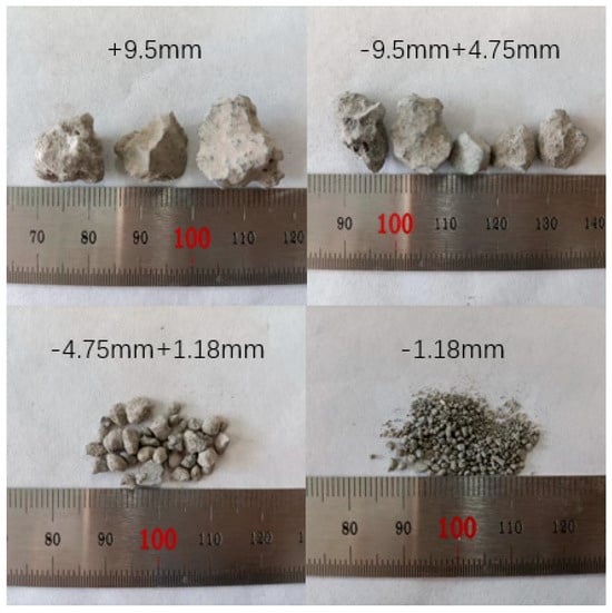 The concentrations of arsenic and antimony in the water were determined by Inductively Coupled Plasma Mass Spectrometry (ICP-MS, Optima 8300, PerkinElmer, USA) and the corresponding removal rate were calculated. The removal rate was calculated according to Equation (1). Desulfurization gypsum and steel slag particles of different sizes are shown in Figure 4 and Figure 5.