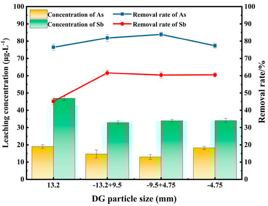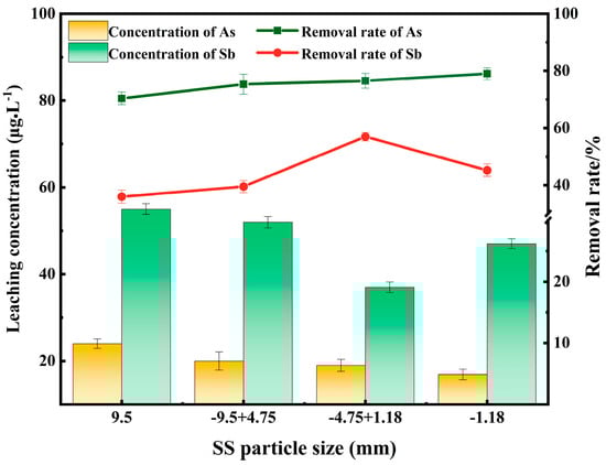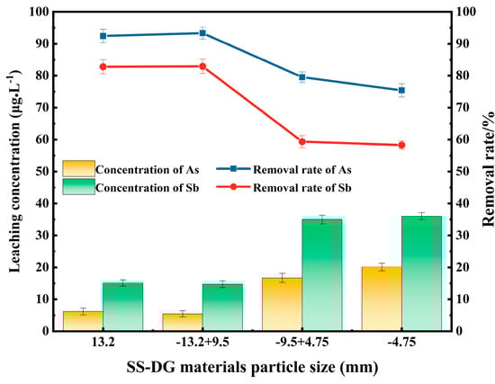 Figure 6 reveals that the concentration of As in polluted water decreases with the decrease in steel slag particle size, that is, the smaller the steel slag particle size, the better the removal effect of As. The concentration of Sb in polluted water decreases first and then increases with the decrease in steel slag particle size, with the removal rate of Sb increasing first and then decreasing with the decrease in steel slag particle size. The steel slag of −4.75 + 1.18 mm has the best removal effect on Sb. On the whole, when the particle size of steel slag is −4.75 + 1.18 mm, the removal effect of Sb is the best, and the removal rate can reach 56.98%. At this time, the removal rate of As reaches 76.54%, which is a good removal performance. This is due to the fact that when the particle size of steel slag decreases, the SS-DG composite material has a larger specific surface area and adsorption sites and therefore exhibits adsorption of more As [30]. However, when the particle size of steel slag is less than 1.18 mm, the pore size of the composite material becomes smaller, which may weaken the adsorption capacity of Sb [31].