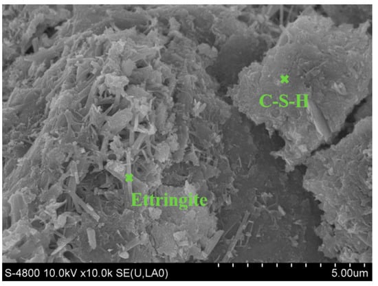 Figure 11 shows the microscopic morphology of the medium after treatment of contaminated water with the permeation reactive material made from steel slag and desulfurization gypsum. According to the results of Table 5 EDX elemental composition, it can be seen that the main hydration products of the permeable reactive composites are C-S-H gel and Ettringite. It is suggested that As is mainly solidified by the C-S-H gel formed by the hydration of steel slag and desulfurization gypsum. The C-S-H gel has a large specific surface area and pore space, which can adsorb and physically encapsulate arsenic ions and their compounds [34]. The interception mechanism of arsenic and associated pollutants using all-solid waste interception materials is shown in chemical Equations (2)–(5) [35].