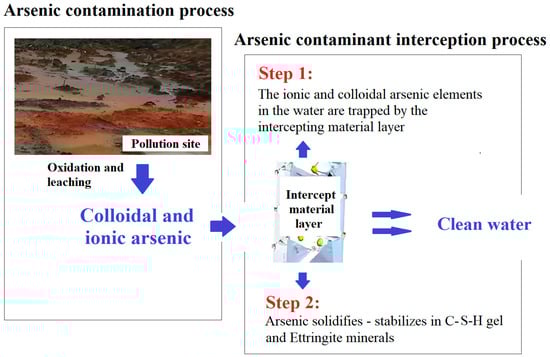 The ionic and colloidal arsenic elements in the water were intercepted by the interception material layer (Figure 12). Among them, the ionic arsenic element was stabilized as CaAsO4 mineral to lose migration activity and is wrapped and solidified with colloidal arsenic element in the newly formed C-S-H gel and ettringite mineral, thereby eliminating arsenic pollution in the water body [38].