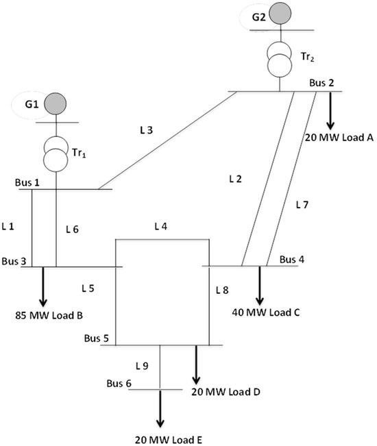 This method gives out the events matrix for numerous flows Fault Tracing paths from the power sources to the loads. “A fault tree is a graphical technique through which the combinations of events leading to a defined system failure are described”. The fault tree is used to deduce the top event, which can mostly be constructed by an OR gate, and AND gate; the description of basic concepts of these logic gates has been reported [21,22]. The RTS test system is used to validate the effectiveness and applicability of the fault tracing paths method. It is not a large composite system, but it has adequate detail and the complexity to reflect the actual complexity involved in an actual system. The RBTS is an essential reliability test system for educational and research purposes, and all required reliability parameters for applying the proposed method are available in this test system. “The RTS test system used in this study follows the standard configuration described in [23], including five load points (20, 85, 40, 20, 20 MW), two generators with 11 units ranging from 5 to 40 MW, six buses, nine transmission lines, and two transformers”. The total system load is 185 MW, with a generation capacity of 240 MW, as depicted in Figure 1. The benefit of this study is determining the component (top event) that cut off and led to the outage of power supply from the load and the reliability evaluation of this component, as illustrated through the analysis of the RTS system. The RTS permits the evaluation of the reliability of every bus bar considering all realistic failure modes.