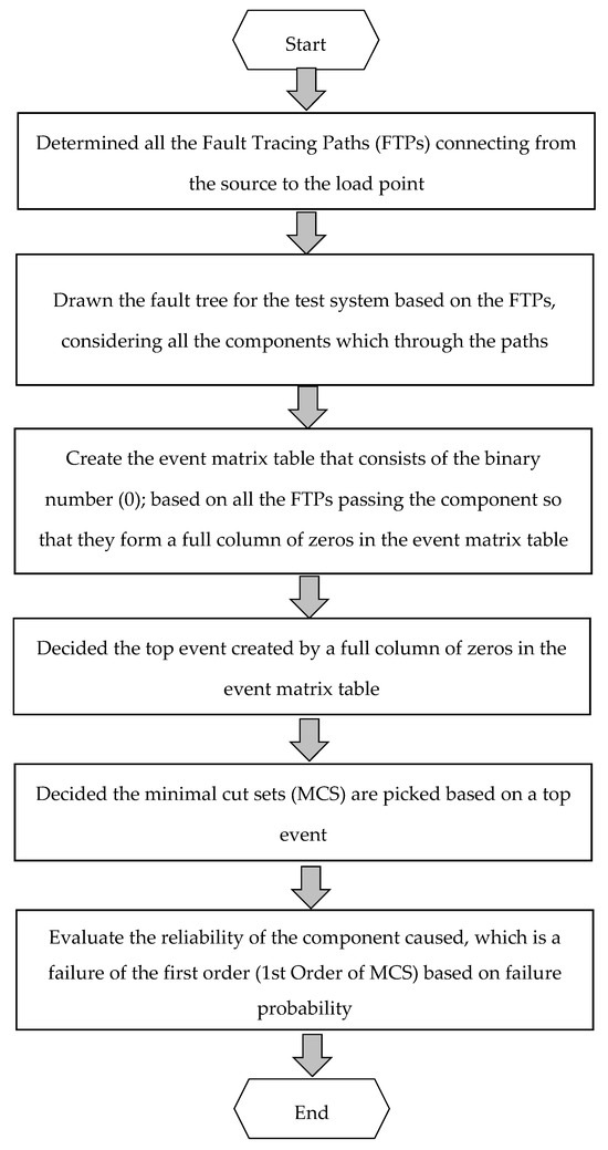 The procedure can be summarized by the following flow chart showing the important stages in this method is to identify the event matrix, top event, and MCSs for the system as shown in Figure 2. The procedure for carrying out a reliability assessment of power equipment in an RTS test system using the fault tree analysis technique is shown in Figure 2.