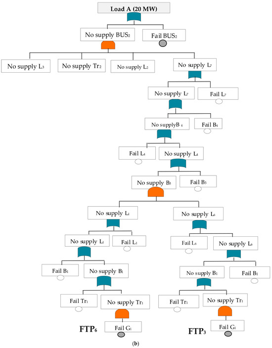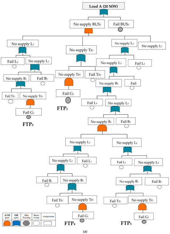 Shows the fault tracing paths based on fault tree structure for load at point A. (a) Represents fault tracing paths FTP1, FTP2, FTP4, and FTP5 between the sources and the load point: (b) Represents fault tracing paths FTP3 and FTP6 between the sources and the load point.