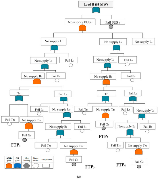 Shows the fault tracing paths based on fault tree structure for load at point B. (a) Represents fault tracing paths FTP1, FTP2, FTP3, and FTP4 between the sources and the load point: (b) Represents fault tracing paths FTP5 and FTP6 between the sources and the load point.