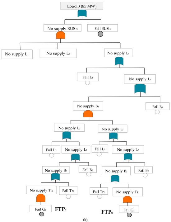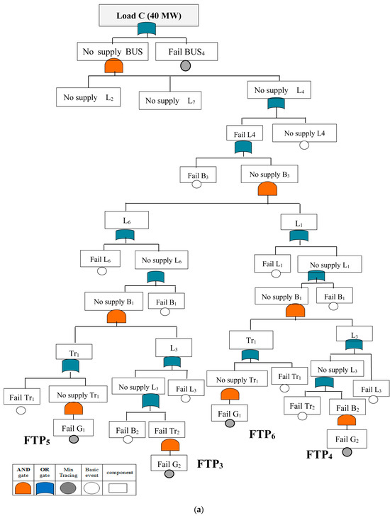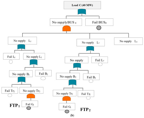 For loads at points B and C, we repeat all previous steps applied at load point A and describe all FTPs between the sources and the load point with a fault tree, as shown in Figure 4 and Figure 5. Then, construct the event matrix and deduce MCSs from all possible failure paths by combining the system components. The results in Table 3, Table 4, Table 5 and Table 6 represent the failure paths, the event matrix, and the MCS for loads B, and C, respectively.