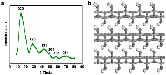 (a) XRD pattern of γ-AlOOH; (b) schematic diagram of the crystal structure of γ-AlOOH.