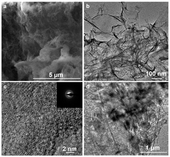The microstructure and morphology of the synthesized γ-AlOOH were characterized by scanning electron microscopy (SEM) and transmission electron microscopy (TEM). As shown in Figure 2a,b, the γ-AlOOH exhibits an ultrathin two-dimensional (2D) nanosheet morphology. The presence of multidirectional wrinkles effectively mitigates stacking-induced agglomeration of the nanosheets, thereby facilitating the exposure of adsorption active sites. Furthermore, high-resolution TEM (HRTEM) and selected-area electron diffraction (SAED) patterns (Figure 2c) reveal the low crystallinity and polycrystalline nature of γ-AlOOH, which is consistent with the XRD results. However, the morphology of γ-AlOOH will change from nanosheets to chaotic nanowires as the reaction time is extended to 5 min (Figure 2d).