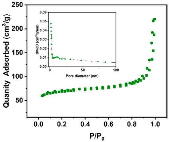 The adsorption capacity of physical adsorption is generally proportional to the specific surface area of the adsorbent. The N2 adsorption–desorption isotherm of the synthesized γ-AlOOH nanosheets was measured to characterize their specific surface area and pore structure. As shown in Figure 3, the isotherm exhibits an H3-type hysteresis loop without a distinct saturation plateau, indicating a heterogeneous pore structure. The calculated specific surface area of the γ-AlOOH nanosheets is 178.6 m2/g and with an average pore diameter of 10.4 nm, demonstrating their potential for heavy metal ion adsorption. The high specific surface area not only increases the density of the active site but also promotes the contact probability between ions in the solution and the surface of the adsorbent, thereby increasing the adsorption capacity. In addition, the nanopore network can shorten the ion diffusion path and accelerate the adsorption kinetics.