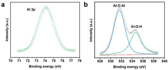 The surface valence states of γ-AlOOH nanosheets significantly influence their adsorption performance. As revealed by the Al 2p (Figure 4a) and O 1s (Figure 4b) XPS spectra, aluminum in γ-AlOOH exists predominantly in the +3 oxidation state, while oxygen is present in two distinct forms: Al–O–Al and Al–O–H. This confirms the abundance of surface -OH groups on the γ-AlOOH nanosheets. Hydroxyl groups are polar groups with lone-pair electron and proton activity and can interact with heavy metal ions in the following ways: (1) Coordination ability: Oxygen atoms provide lone pairs of electrons that form coordination bonds with heavy metal ions; (2) Surface charge regulation: The protonation/deprotonation state of the hydroxyl group affects the surface charge of the adsorbent, which in turn regulates the electrostatic adsorption capacity.