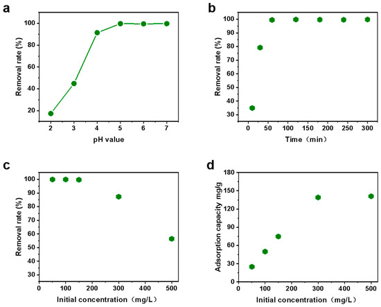 (a) The removal rate of Cu2+ adsorbed by γ-AlOOH under different pH; (b) the removal rate of Cu2+ adsorbed by γ-AlOOH under different adsorption time; (c) the removal rate of Cu2+ adsorbed by γ-AlOOH under different initial concentrations; (d) the amount of Cu2+ adsorbed by γ-AlOOH at different initial concentrations.