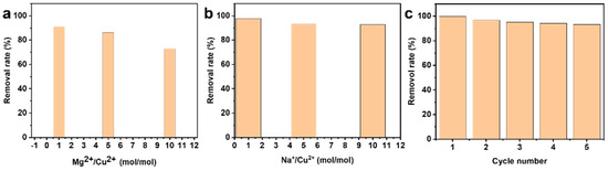 (a) Removal rate of Cu2+ with γ-AlOOH nanosheets as an adsorbent under different molar ratios of Mg2+/Cu2+ in the mixed solution. (b) Removal rate of Cu2+ with γ-AlOOH nanosheets as an adsorbent under different molar ratios of Na+/Cu2+ in the mixed solution. (c) Variation in the capacity of Cu2+ sorption onto γ-AlOOH nanosheets in successive cycles.