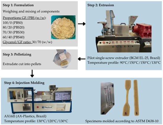 To produce the biocomposites, glue flour (GF) containing 19% amylose was sourced from a wheat mill in Curitiba, Paraná, Brazil. Glycerol, with a purity of 99.5%, was provided by Alphatec Ltda., São Paulo, Brazil. The PBS (TH803-S) was also obtained from Xinjiang Blueridge Tunhe Chemical Industry Co., Ltd., Changji, Xinjiang, China.