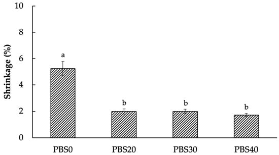 The shrinkage exhibited no statistically significant differences among the PBS20, PBS30, and PBS40 samples, with values of 1.99% ± 0.20, 2.00% ± 0.17, and 1.73% ± 0.11, respectively. Suggesting that even small amounts of PBS (~20%) are enough to improve dimensional stability.
