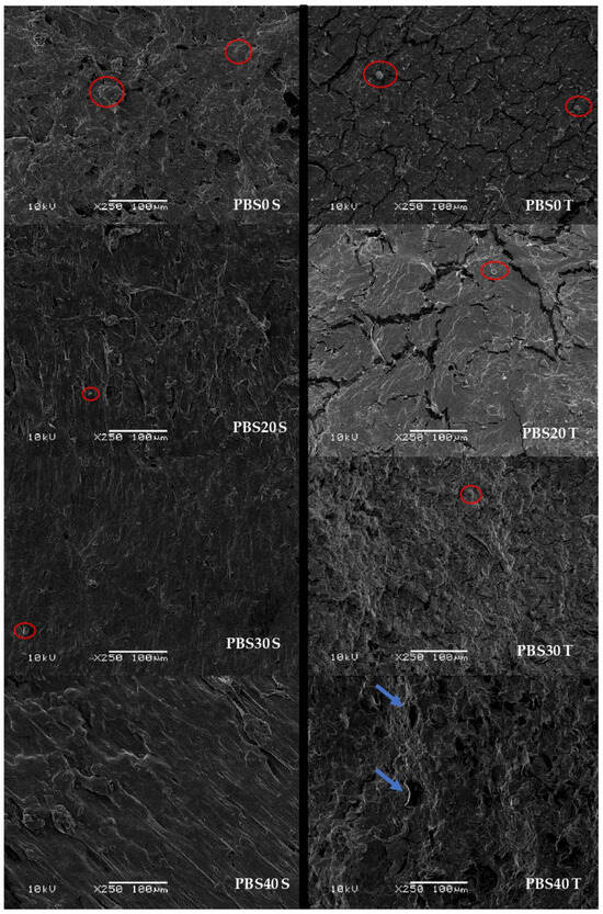 SEM micrographs of PBS0, PBS20, PBS30, and PBS40 surface (S) and cross-section (T). Red circles: GF granules; Blue arrows: fiber folds.