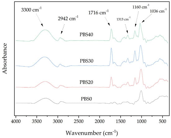 Figure 5 shows the FTIR spectra of the PBS0, PBS20, PBS30, and PBS40 samples. The FTIR spectra of the PBS20, PBS30, and PBS40 samples exhibited a prominent band around 3300 cm−1, along with peaks at 2942, 1716, 1313, 1160, and 1036 cm−1.