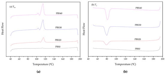 The thermal analysis of the biocomposites, with and without the addition of PBS, is presented in Figure 6. All samples demonstrated similar thermal behavior, except for the one without PBS (PBS0). The samples exhibited both endothermic and exothermic peaks, with a melting temperature (Tm) of approximately 115 °C and a crystallization temperature (Tc) of around 80 °C, respectively. These results indicate that the presence of PBS significantly influenced the thermal behavior of the materials containing PBS compared to those without it. A previous study by Schlosser [27] reported a Tm of 122.06 °C and a Tc of 82.25 °C for films of PBAT/GF blend containing 60%PBAT, 24% GF, and 16% glycerol.