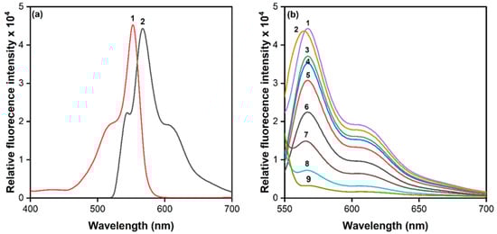 Fluorescence properties of IA extracts: (a) excitation (1) and emission (2) spectra of picrate IA; (b) effect of PA (1–6), 4-NP (7), 3,4-DNP (8) and excitation wavelength (1–9). c (AF) = 2 × 10−6 M; c (PA; 3,4-DNP; 4-NP) = 4 × 10−8 M; n-amyl acetate. 1, 7, 8, 9—540 nm, 2—550 nm, 3—530 nm, 4—520 nm, 5—510 nm, 6—500 nm.