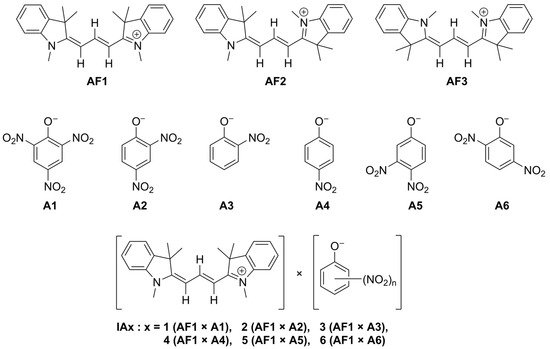 Structures of separate ions and IA considered in theoretical study. Trans-1,3,3-trimethyl-2-[(1E)-3-[(2E)-1,3,3-trimethyl-2,3-dihydro-1H-indol-2-ylidene]prop-1-en-1-yl]-3H-indol-1-ium (AF1), cis-1,3,3-trimethyl-2-[(1E)-3-[(2E)-1,3,3-trimethyl-2,3-dihydro-1H-indol-2-ylidene]prop-1-en-1-yl]-3H-indol-1-ium (AF2), cis-1,3,3-trimethyl-2-[(1E)-3-[(2Z)-1,3,3-trimethyl-2,3-dihydro-1H-indol-2-ylidene]prop-1-en-1-yl]-3H-indol-1-ium (AF3), picrate (A1), 2,4-dinitrophenolate (A2), 2-nitrophenolate (A3), 4-nitrophenolate (A4), 3,4-dinitrophenolate (A5), and 2,5-dinitrophenolate (A6), as well as ionic associates of AF1 cation with A1 anion (IA1), with A2 anion (IA2), with A3 anion (IA3), with A4 anion (IA4), with A5 anion (IA5), and with A6 anion (IA6).