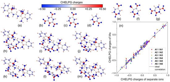 CHELPG partial charges of the AF1 cation (a); anions A1 (b), A2 (c), A3 (d), A4 (e), A5 (f), A6 (g); and IAs IA1 (h), IA2 (i), IA3 (j), IA4 (k), IA5 (l), and IA6 (m). The correlation between the charges in IAs and free ions is shown (n).