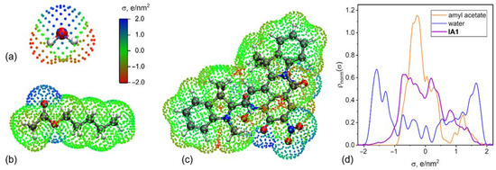 Segments (shown as dots) that were used to calculate the properties of the COSMO-RS surface of water (a), amyl acetate (b), and IA1 (c). σ-profiles of water (blue), amyl acetate (orange), and IA1 (purple) are shown in the frame (d).