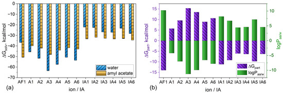 (a) COSMO-RS free energies of solvation (ΔGsolv in kcal/mol) of ions and IA in water (blue) and amyl acetate (yellow); (b) free energies of partition (ΔGpart in kcal/mol, purple bars) and partition coefficient (logPaa/w, green bars) of free ions and IAs between water and amyl acetate.