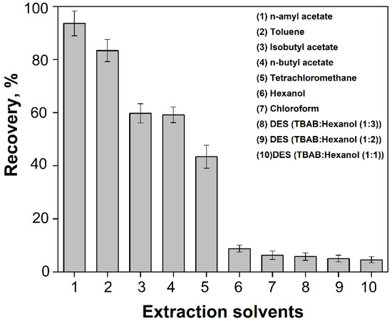 Based on the measured results, it can be concluded that chloroform, n-butyl acetate, isobutyl acetate, tetrachloromethane, hexanol, and DESs exhibit only low extraction efficiency, while n-amyl acetate and toluene demonstrate good extraction efficiency (Figure 7). Considering the measured results and also the ecological impact, we chose n-amyl acetate as the optimal extraction phase, as it is the most suitable extractant and also meets the requirements for green analytical chemistry due to its low toxicity.