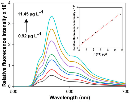 Upon establishing the optimal conditions, we generated a calibration curve for PA determination. A linear increase in relative fluorescence intensity was observed with rising PA concentrations in the measured extracts (Figure 8). This linearity in the calibration curve for microextraction into 500 µL of n-amyl acetate was maintained over a PA concentration range of 0.92 to 11.45 µg L−1. The regression equation for the calibration line was y = (2793 ± 96)x + (2027 ± 588), where y denotes the relative fluorescence intensity and x represents the PA concentration in µg L−1, with a correlation coefficient R2 = 0.9930. The limit of detection (LOD), calculated as three times the standard deviation of the blank, was 0.40 µg L−1, while the limit of quantification (LOQ), calculated as ten times the standard deviation of the blank, was 1.30 µg L−1.