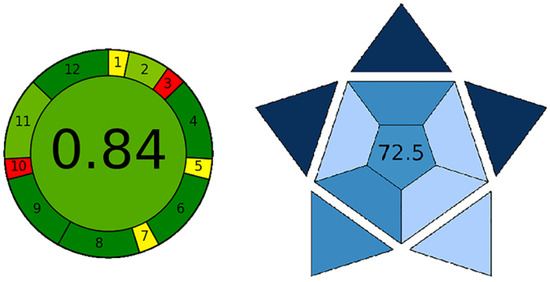 Green analytical chemistry focuses on improving analytical methods to make them more environmentally sustainable and safer for human health, considering factors such as reagent toxicity, waste generation, energy consumption, and procedural complexity. To assess the greenness and practicality of our VALLME-FLD method, we used a combination of the Analytical GREEnness (AGREE) and Blue Applicability Grade Index (BAGI) tools. The AGREE tool provides a unified score ranging from 0 to 1 based on the 12 principles of green analytical chemistry, while the BAGI evaluates ten key attributes, such as the type of analysis, the number of analytes, sample throughput, reagent types, and the degree of automation, generating an asteroid pictogram with the corresponding score [73,74]. The results of the evaluation using these tools are shown in Figure 9.