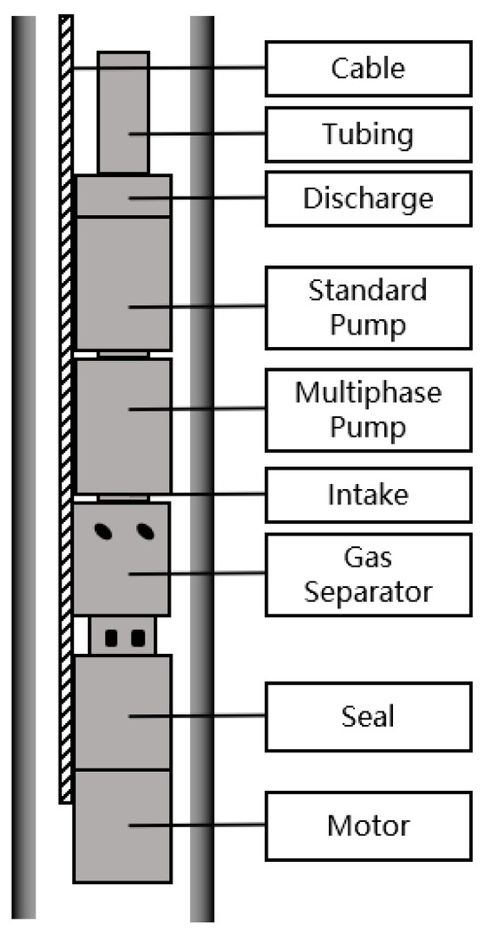 Recent studies have also focused on the challenges of ESP operation in high gas–liquid ratio (GLR) conditions. The flow rate within the pump fluctuates considerably due to the gas compression caused by the stage-by-stage pressurization within the pump. As a result, a tapered ESP system is required [6,7]. A schematic of its structure is shown in Figure 1. In such systems, a multiphase flow pump with a higher nameplate flow rate is typically used as the lower pump, while a conventional pump with a lower nameplate flow rate is usually employed as the upper pump [8,9]. Designers need to consider the appropriate combination of pump models and stage numbers. Moreover, for most gas reservoirs, the daily liquid and gas production rates of the same gas well can vary significantly over time, making the sizing procedure even more challenging.