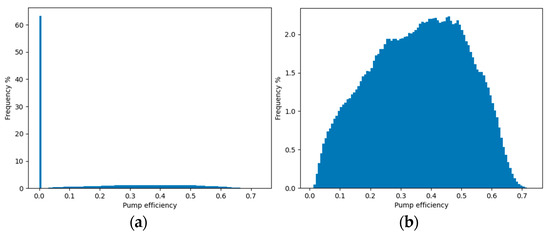 Pump efficiency distribution histogram before and after screening out data with a pump efficiency of 0: (a) before screening; (b) after screening.