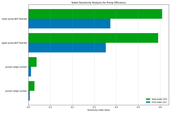 To identify the most influential pump sizing parameters on pump efficiency, a sensitivity analysis was conducted using the Sobol method. Given the complexity of the ESP performance curves, the best efficiency point (BEP) flow rate of each pump model was used to represent the pump characteristics. The results of the sensitivity analysis are shown in Figure 4. The analysis reveals that the BEP flow rates (pump models) of two pumps are the most significant factors affecting pump efficiency, accounting for approximately 60% of the total variance. In contrast, the pump stage numbers have a relatively minor impact. This finding underscores the importance of selecting pumps with appropriate BEP flow rates to maximize efficiency while the number of stages can be adjusted within a reasonable range without significantly affecting performance.