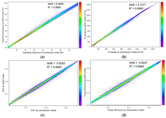 Comparison of calculation results of mechanism model and FCNN model: (a) operating frequency; (b) flow rate; (c) GVF; and (d) pump efficiency.