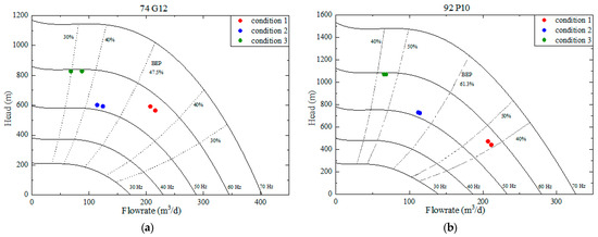 The working points of 74-G12 and 92-P10 under various preset working conditions are plotted on the ESP performance tornado curves, as shown in Figure 7. The dotted lines in the figure represent the working points corresponding to the same pump efficiency at different operating frequencies. Each pump has two points under each working condition, representing the working points corresponding to the intake and discharge parameters of each pump. As can be analyzed from Figure 7, all operating points are located in the range of higher pump efficiency, thus ensuring the efficient operation of the pump and reducing the potential risk of failure.