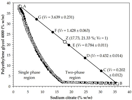 Binodal data of the mixture of trisodium citrate and polyethylene glycol 4000 and identification of the prepared aqueous biphasic systems (A to G and Z). is volume ratio (Equation (2)). Values after the ± sign indicate standard deviation. Different symbols on the binodal curve correspond to different experimental routines.