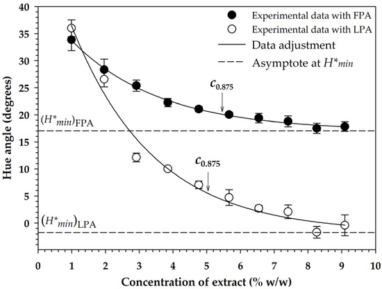 Variation of the hue angle of a beverage with the addition of pigmenting agents applied in fluid form (FPA) and in lyophilized form (LPA). The symbol is the minimum hue angle that can be achieved with an infinite addition of pigmenting agents. The abbreviation is the required concentration to have 87.5% pigmentation with respect to .