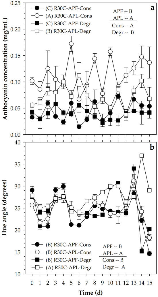 (a) Variation of anthocyanin content and (b) hue angle in a beverage pigmented with FPA and LPA obtained with ATPE with 30 min rest and subsequent centrifugation (S30C) under conservative (Cons) and degradative (Degr) conditions. Equal letters (A or B) indicate a non-significant difference (Tukey, 0.05).
